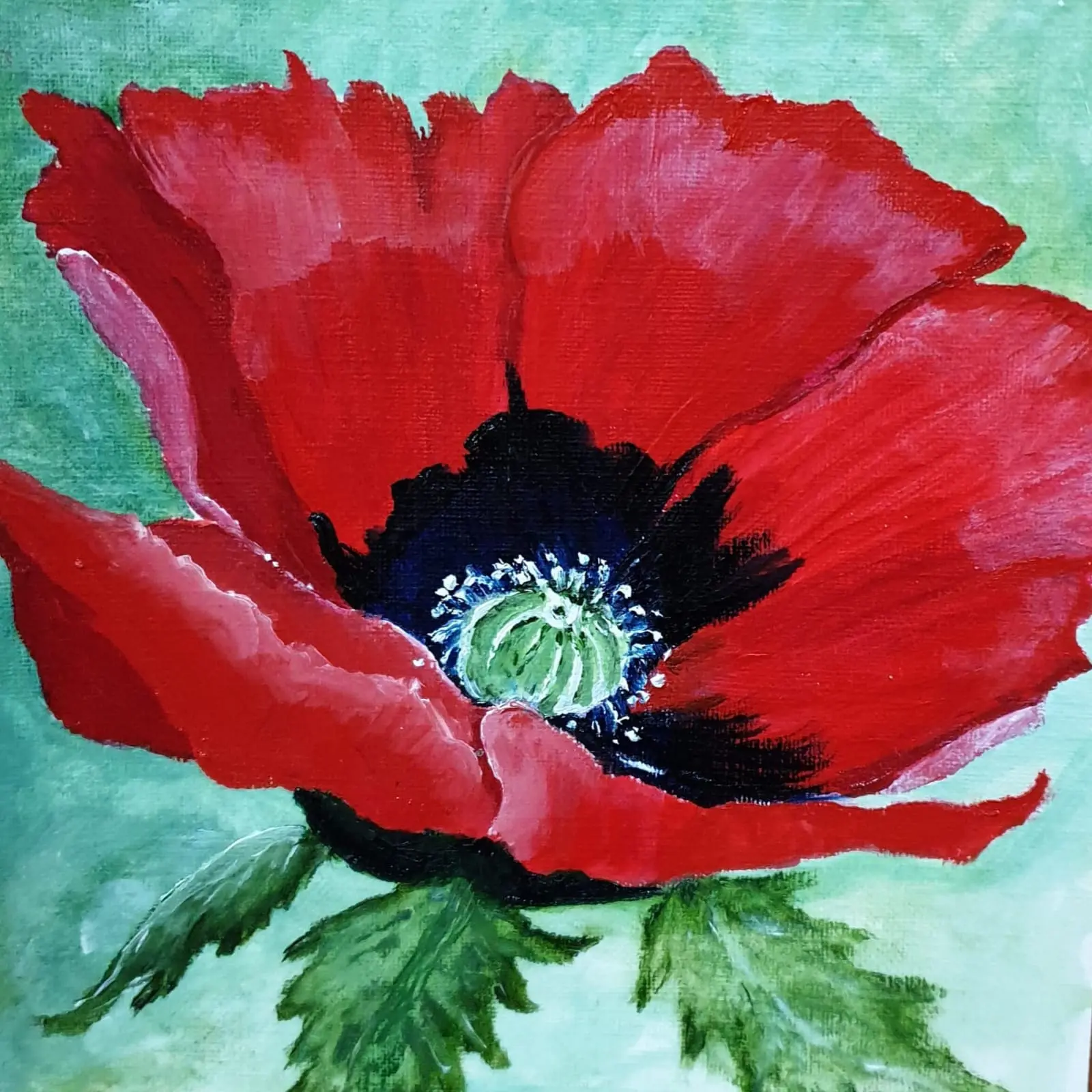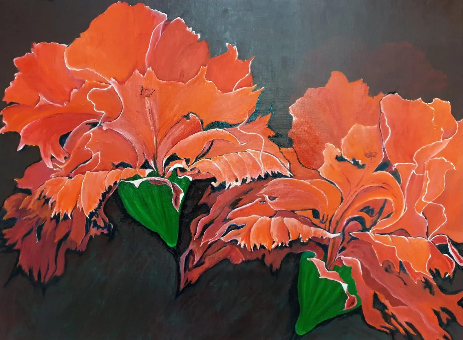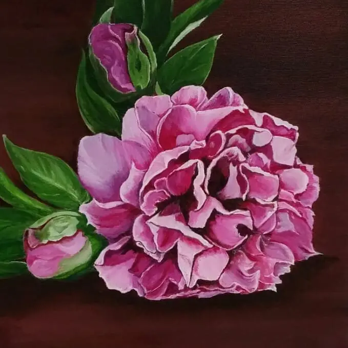 “Natuurlijk heb ik ook wel favorieten hoor. Kijk deze dan!” Ellen laat een foto zien. “Dit is echt een schatje, enig. Het is een klein werk. Ik ben ook altijd aan het twijfelen of het werk wel écht af is.” En dan gebeurt het weleens dat Ellen een schilderij even opzij zet, om het na een tijdje er weer bij te pakken en er iets aan te veranderen of aan toe te voegen. “Neem dit schilderij bijvoorbeeld. Ik heb laatst pas een steeltje toegevoegd”, Ellen laat een foto zien van haar meest recente werk; twee fantasiebloemen op een donkere achtergrond.