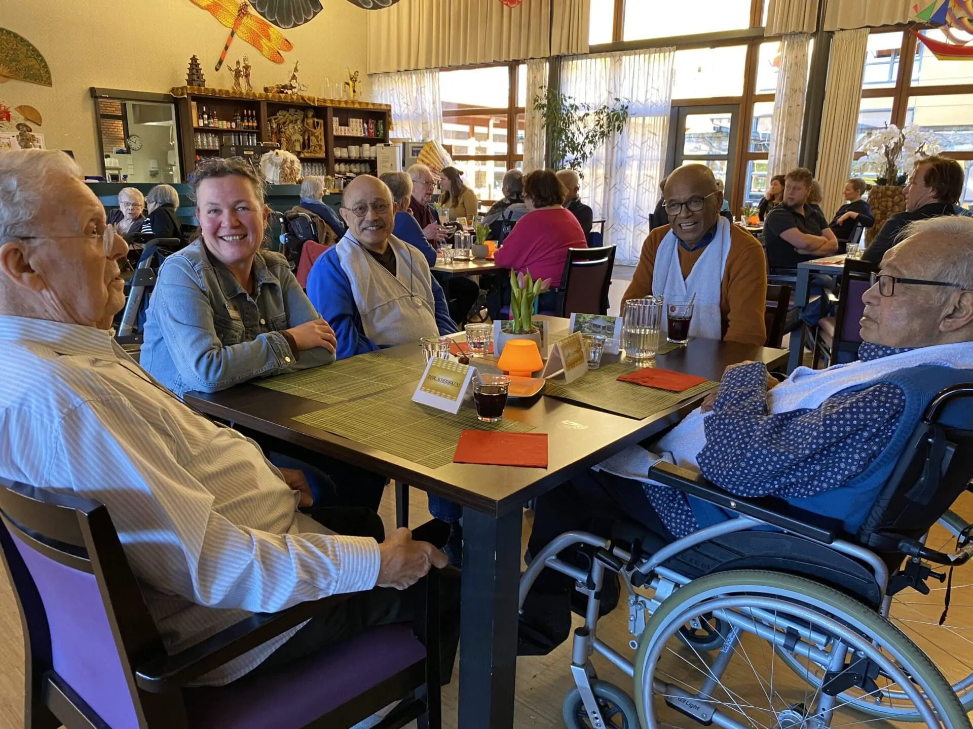 “Wat ik zo fijn vind aan Rumah Kita is dat het niet naar ziekenhuis ruikt, dat het niet zo klinisch is”, vertelt mevrouw Sombroek. Mevrouw woont nu zo’n 2 jaar hier. Het is de eerste keer dat ze deze viering meemaakt. “Vorig jaar had iedereen van mijn afdeling corona, behalve ik. We moesten allemaal in isolatie. Het is wel gezellig hoor zo’n feestelijke dag, maar het is ook wel druk. Straks ga ik mijn vriend ophalen, die woont hier ook en dan gaan we samen naar de muziek.”