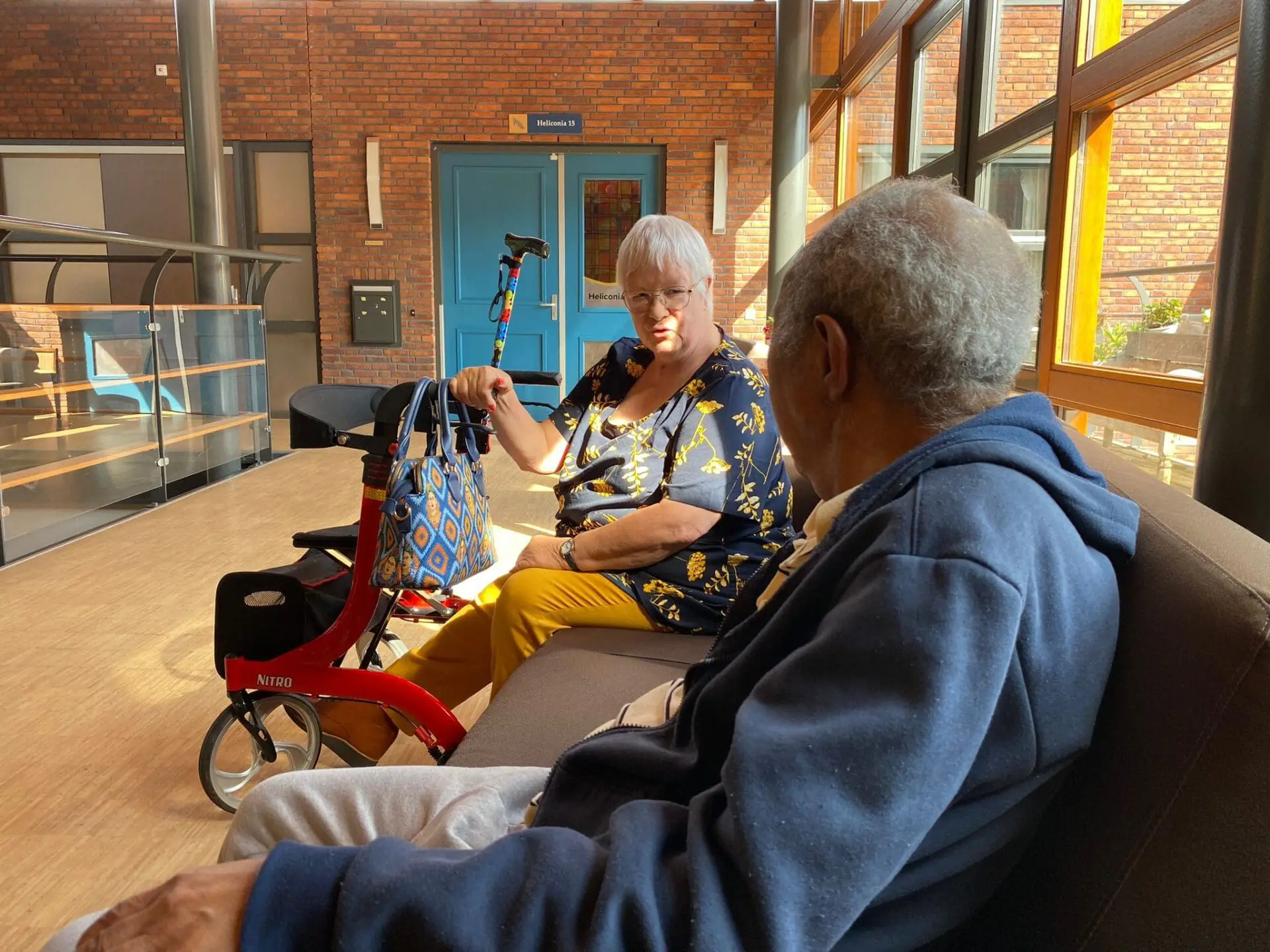 Medewerker Welzijn Lena Lawalata neemt Gert mee naar verschillende bewoners. “Dit is tante Becka”, Lena stelt een bewoner aan Gert voor. Lena en tante Becka praten in het Moluks. Ook Gert heeft zich voorbereid. Ze pakt haar boekje erbij en leest een aantal zinnetjes Moluks voor. In het gezicht van tante Becka is herkenning te zien, ze antwoordt ook in het Moluks. “Dit was het hoor qua Moluks”, lacht Gert. “Ik vind het zo mooi dat jullie de bewoners met tante aanspreken.” “Dit heeft alles te maken met respect hebben voor elkaar”, vertelt Lena.