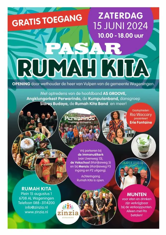 Traditiegetrouw organiseert verpleeghuis Rumah Kita weer de Pasar Rumah Kita op zaterdag 15 juni van 10.00 tot 18.00 uur. Rumah Kita is een verpleeghuis speciaal voor Indische en Molukse ouderen in Wageningen en een locatie van Zinzia Zorggroep.