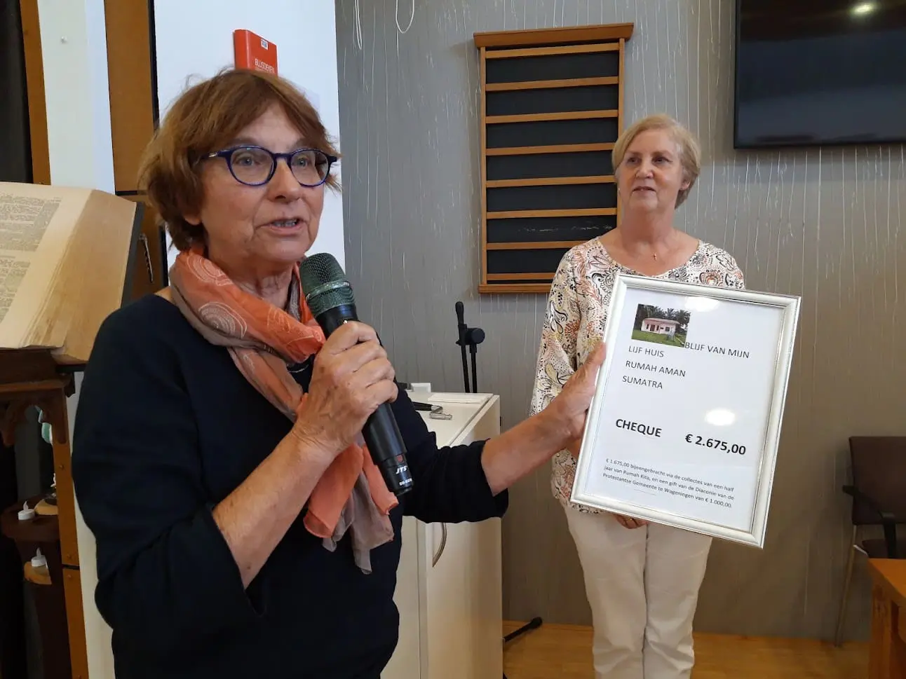 Tijdens de kerkdienst van 28 augustus jl. is bekend gemaakt dat de collectes 1.675 euro hebben opgebracht. De diaconie van de Protestantse Gemeente Wageningen heeft daar 1.000 euro aan toegevoegd waardoor het totaalbedrag kwam op 2.675 euro. Diaken Wilma van Brakel overhandigde dit mooie totaalbedrag symbolisch aan Grietje Zeeman. Grietje vertegenwoordigde de Stichting die contacten onderhoudt met Rumah Aman.
