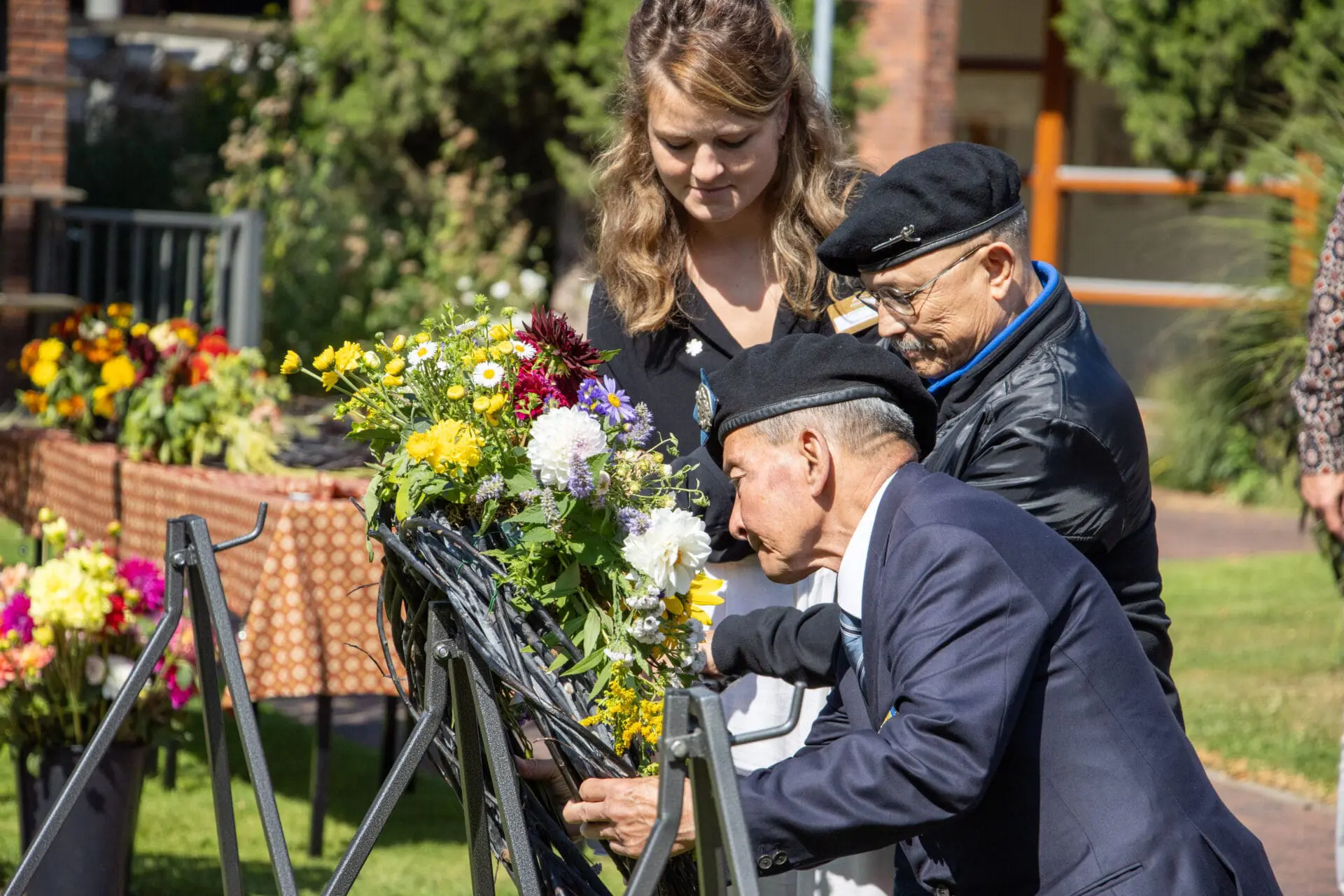Na de plechtige taptoe door trompettist Arie van Kan was er 1 minuut stilte, waarna het Wilhelmus werd gezongen. Tijdens het Wilhelmus hesen mevrouw Ter Haar, bewoner van Rumah Kita, en clustermanager Kevin Dekker, de vlag van half stok naar de top. Vervolgens werden er drie kransen bij het monument gelegd. Eén namens de bewoners van Rumah Kita, één namens de gemeente Wageningen en één namens de 2e, 3e en 4e generatie. Daarna liepen de aanwezigen langs het monument en legden zelf één voor één bloemen neer.