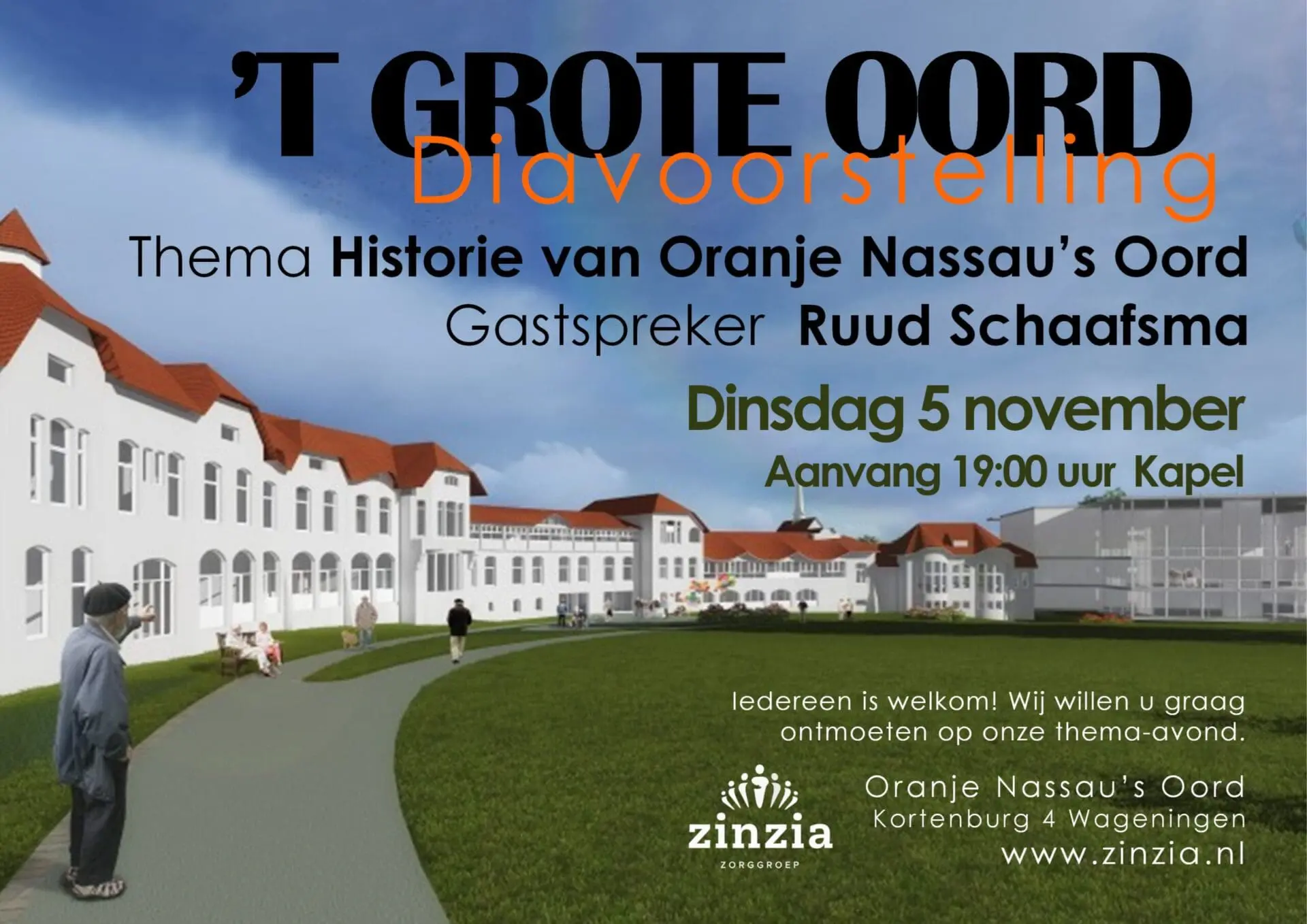 De Oranje Nassau’s Oord is een verpleeghuis. Graag willen wij onze deuren open zetten, met als doel onze buren te ontmoeten en met elkaar verbinden. Iedereen is welkom!