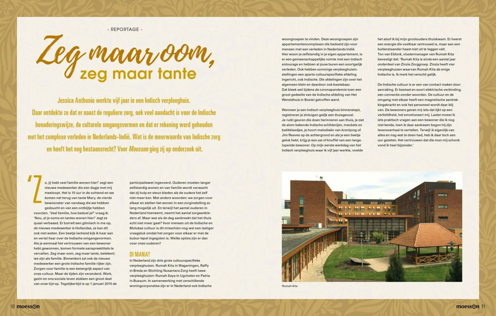 Uit het artikel in de Moesson: Wanneer je een Indisch verpleeghuis binnenstapt, registreren je zintuigen gelijk een thuisgevoel. Je ruikt geuren die doen herinneren aan thuis, je ziet de alom bekende Indische schilderijen, meubels en batikkleedjes, je hoort melodieën van krontjong of Jim Reeves op de achtergrond en als je een beetje geluk hebt, krijg je een aai of knuffel van een langslopende bewoner. Er heerst een energie die voelbaar vertrouwd is, maar aan een buitenstaander haast niet uit te leggen valt. Ton van Eldonk, clustermanager van Rumah Kita bevestigt dat: ‘Rumah Kita is sinds een aantal jaar onderdeel van Zinzia Zorggroep. Zinzia heeft vier verpleeghuizen waarvan Rumah Kita de enige Indische is. Ik merk het verschil gelijk.’
