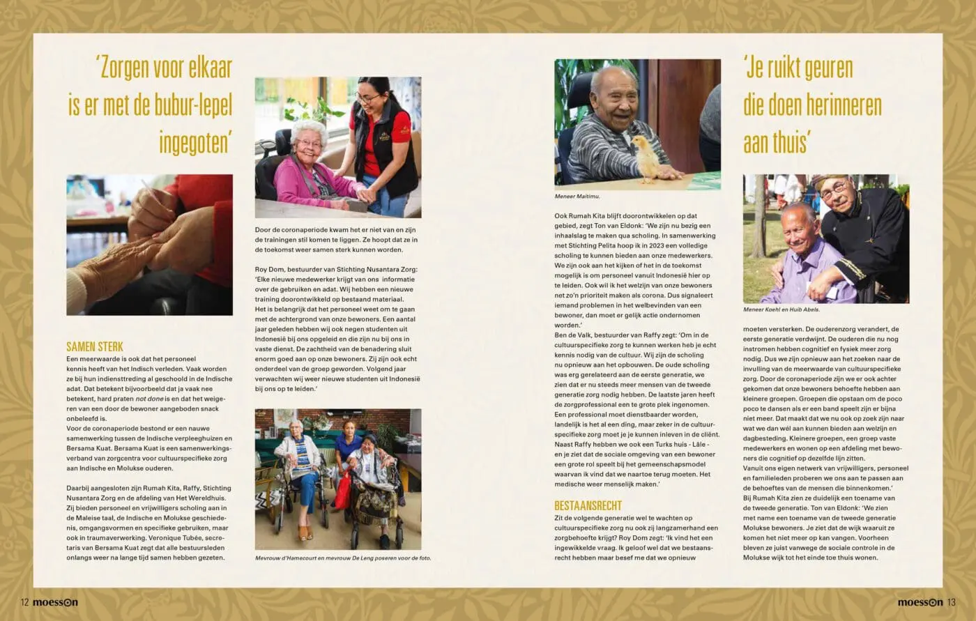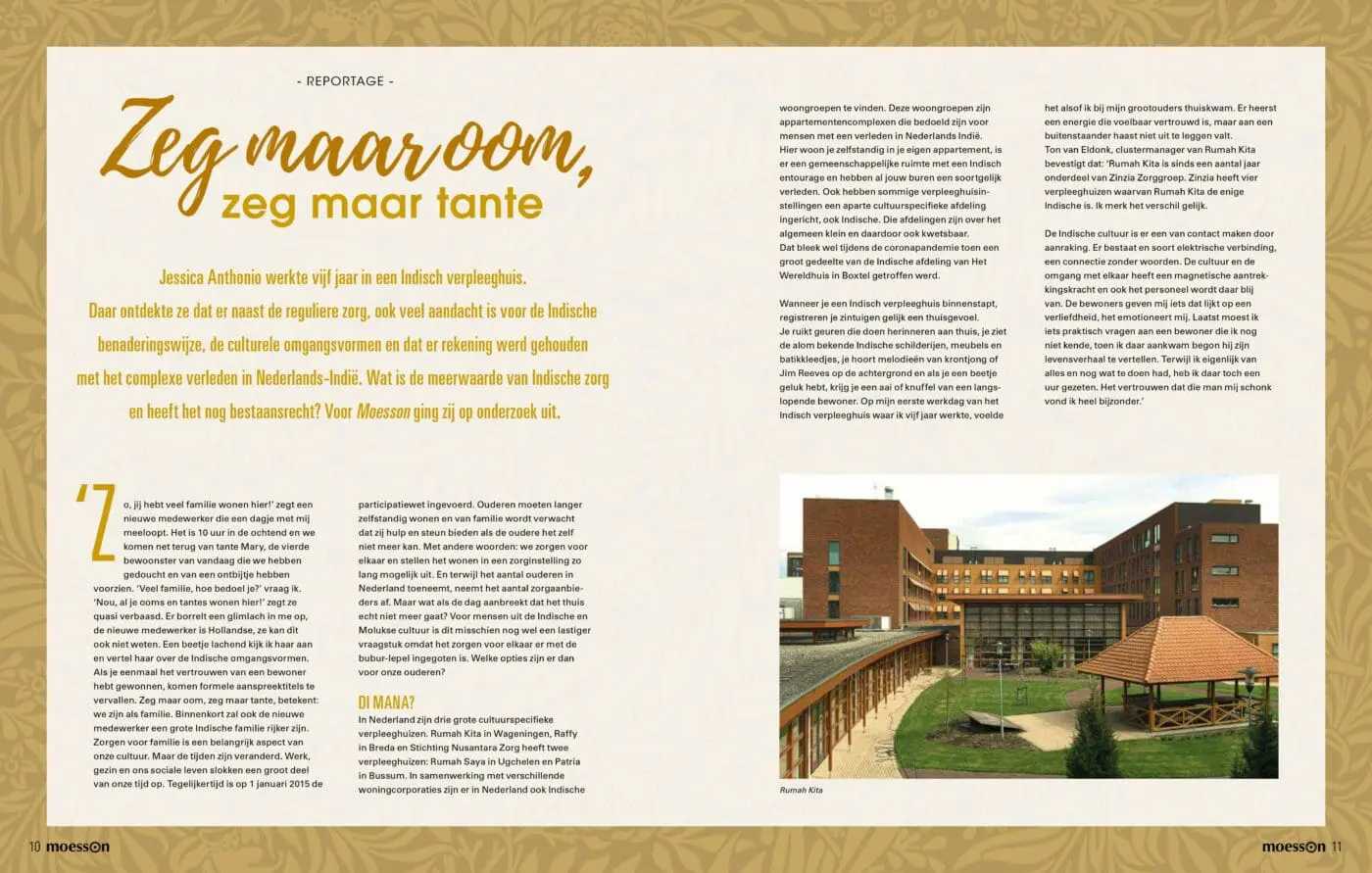 Wat is de meerwaarde van Indische zorg en heeft het nog bestaansrecht? Voor Moesson ging redacteur Jessica Anthonio op onderzoek uit. Jessica heeft zelf ook vijf jaar gewerkt in een Indisch verpleeghuis. Hier ontdekte ze dat er naast de reguliere zorg, ook veel aandacht is voor de Indische benaderingswijze en de culturele omgangsvormen. En dat er rekening werd gehouden met het complexe verleden in Nederlands-Indië. Voor dit artikel sprak ze onder andere met Ton van Eldonk, clustermanager bij Rumah Kita.