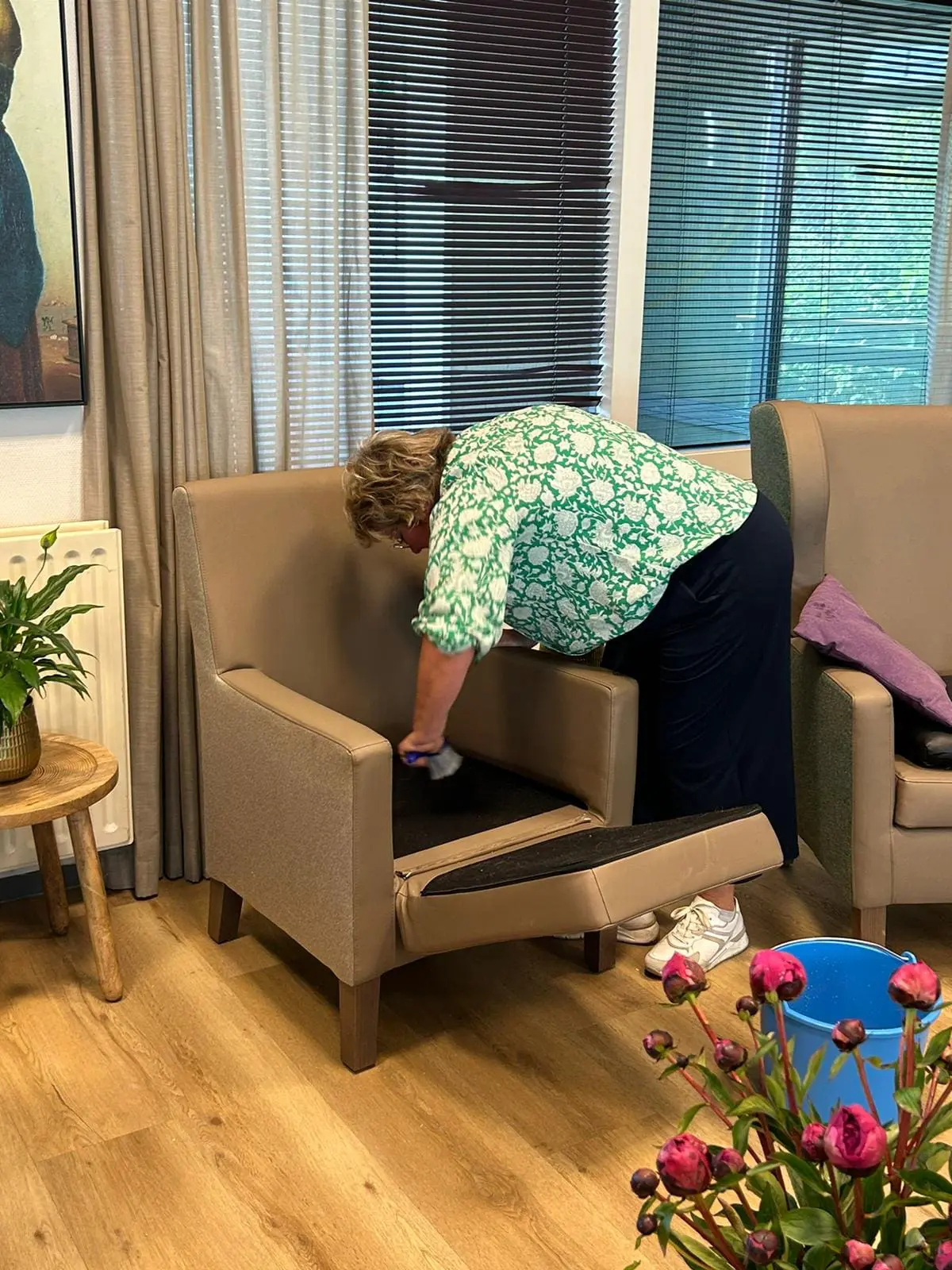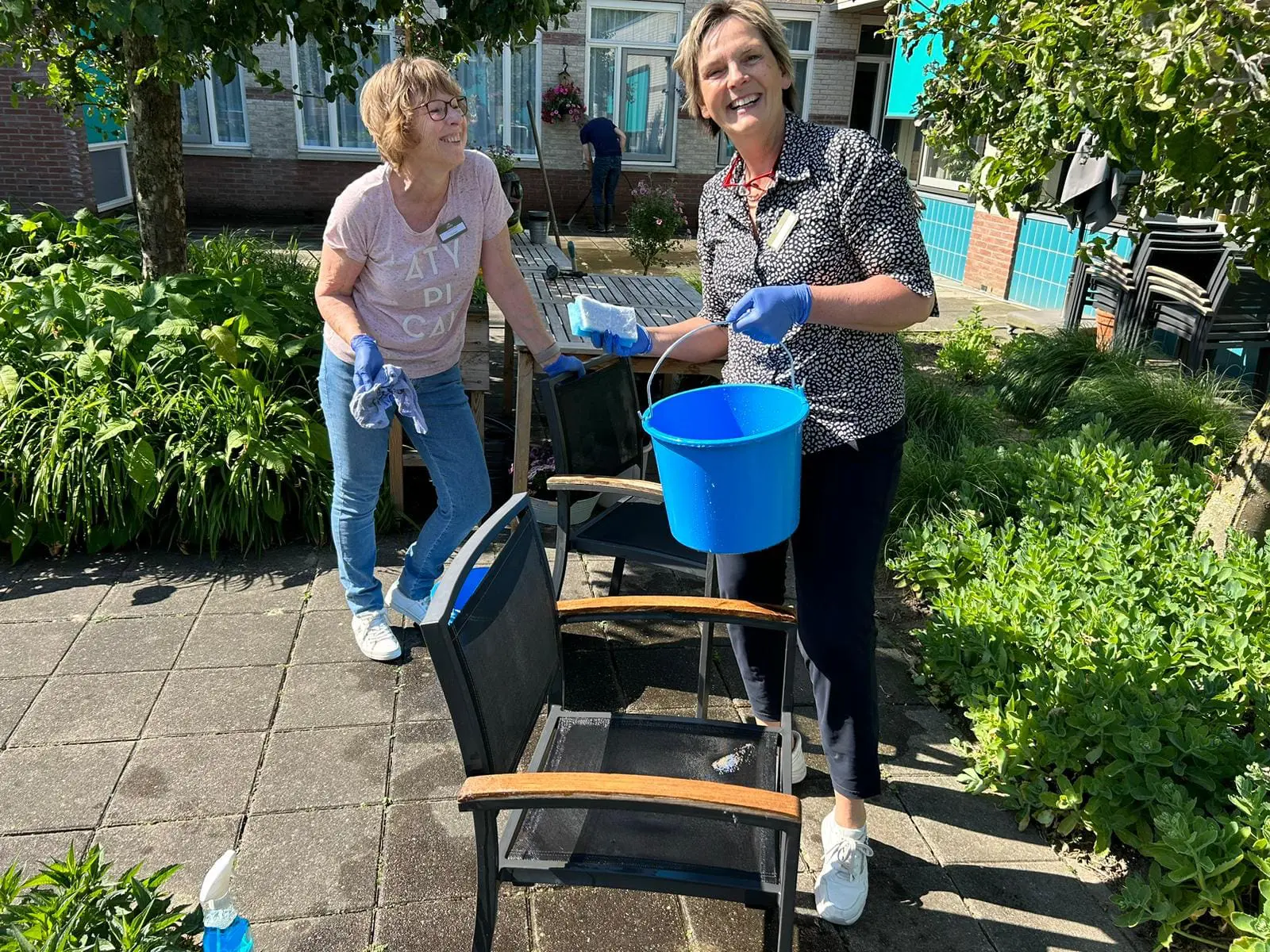 Een groep enthousiastelingen, waaronder naasten, collega’s en vrijwilligers, stak de handen uit de mouwen. Tuinmeubelen werden schoongespoten, meubelen geschrobd, boekenkasten uitgezocht en nog veel meer allerhande klusjes kwamen aan bod. Zo zie je maar weer, met een beetje hulp kun je veel aanpakken in een ochtendje! Na al dat harde werk werd de ochtend gezamenlijk afgesloten met een lekkere lunch.