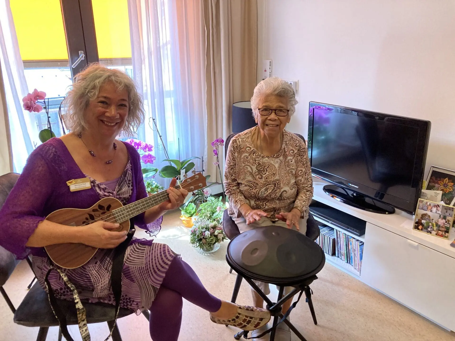 Op de foto’s: Monique met bewoner mevrouw Bleeker-Samuels die het instrument bespeelt en een close-up van de “Suka Muka”.