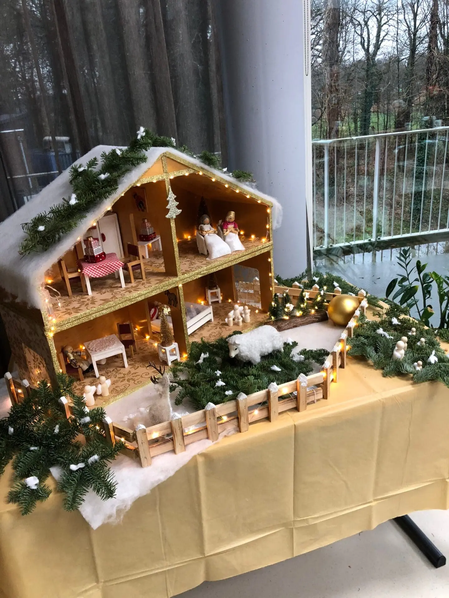 Een poppenhuis omtoveren tot een kersthuis…je moet er maar op komen! “Ik zag op een weggeefhoek op Facebook dat er een poppenhuis werd aangeboden. Die is voor mij dacht ik, daar kan ik samen met mevrouw iets moois van maken”, vertelt medewerker welzijn Tine van den Bosch. En dat is gelukt. Het kersthuis staat nu op de huiskamer van Koningsbosch.