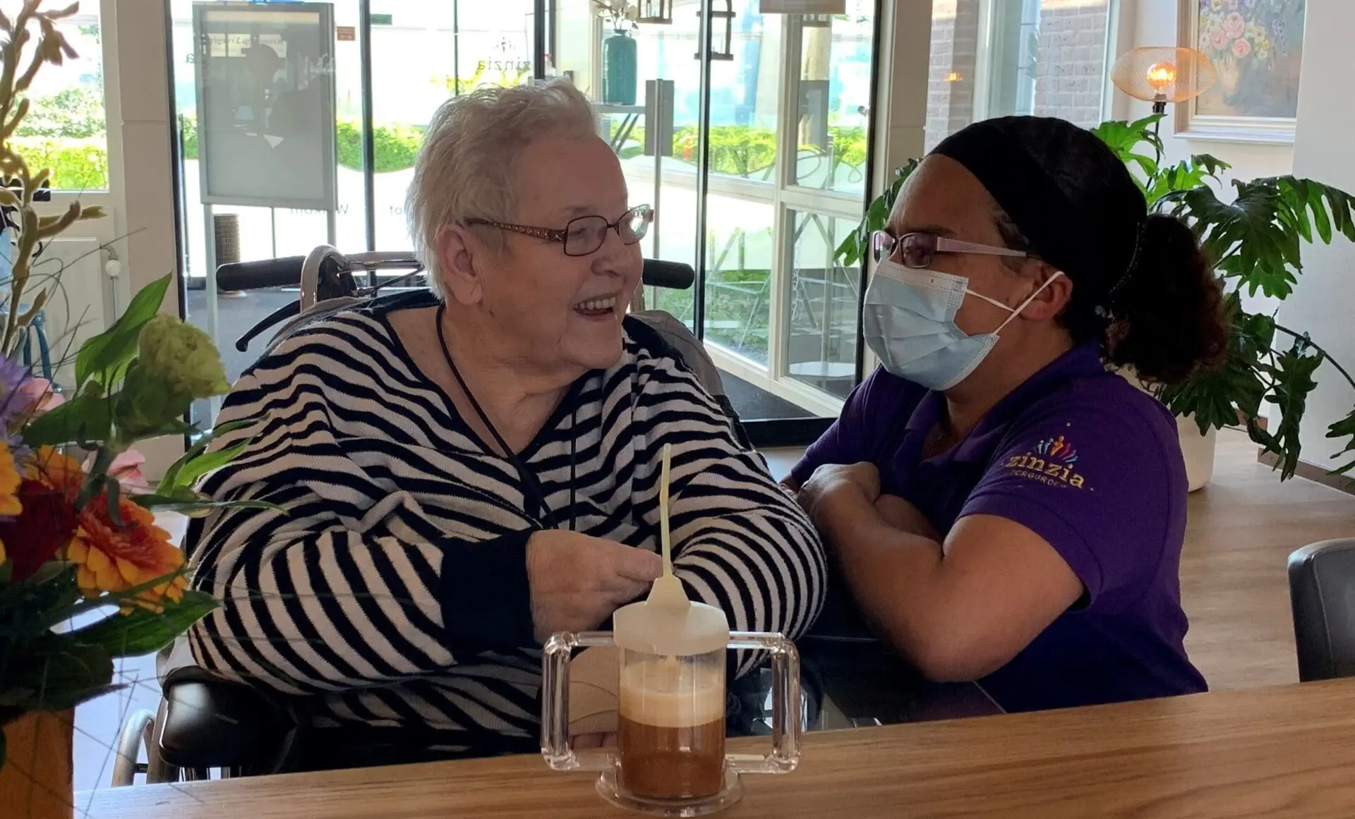Inmiddels zijn we ruim een jaar verder, want corona gooide ook voor Esther roet in het eten. Op het moment dat ze werd toegelaten bij de opleiding ging het hele land en dus ook het verpleeghuis dicht. “Dit was heel raar, want ik had net voor de volle 100% de keuze gemaakt om de zorg in te gaan. Ik mocht van school alleen pas in augustus starten met mijn stage bij De Rijnhof. En helaas kon ik in de tussentijd ook geen vrijwilligerswerk doen.” Na de zomervakantie was het dan zover, Esther mocht beginnen, maar toch voelde het de eerste paar dagen raar om in een poloshirt rond te lopen. “Het was even wennen, als vrijwilliger zie je de mensen pas als ze aangekleed beneden zijn. Nu zie je ook wat daaraan vooraf gaat en dat is nog steeds intensief en indrukwekkend. Toch wist ik op dag twee dat ik de goede keuze heb gemaakt en daar sta ik vandaag de dag nog steeds achter.”