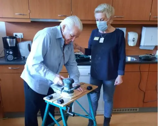 Iedere dinsdagmorgen werkt een aantal bewoners van De Lingehof onder begeleiding van enthousiaste vrijwilligers aan houten werkstukjes. De afgelopen maanden maakten zij onder andere borrelplanken, dienbladen en servethouders. Op de foto zie je hoe meneer Peters samen met vrijwilligster Liesbeth druk bezig is met de voorbereidingen.