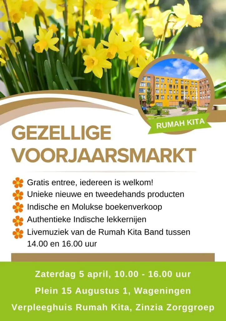 Op zaterdag 5 april 2025 brengt Rumah Kita de lente tot leven met een sfeervolle Voorjaarsmarkt. Tussen 10.00 en 16.00 uur is iedereen welkom op Plein 15 Augustus 1 in Wageningen.