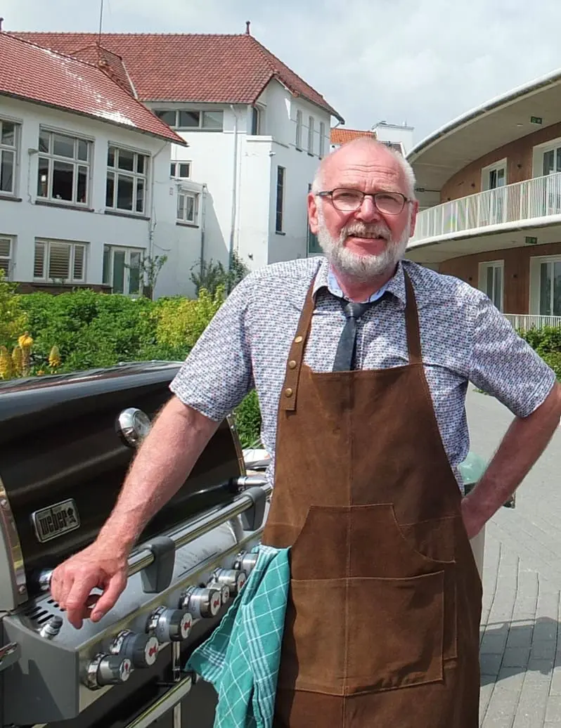 Foto: vader van Neeltje bij de barbecue in de tuin van Oranje Nassau’s Oord.