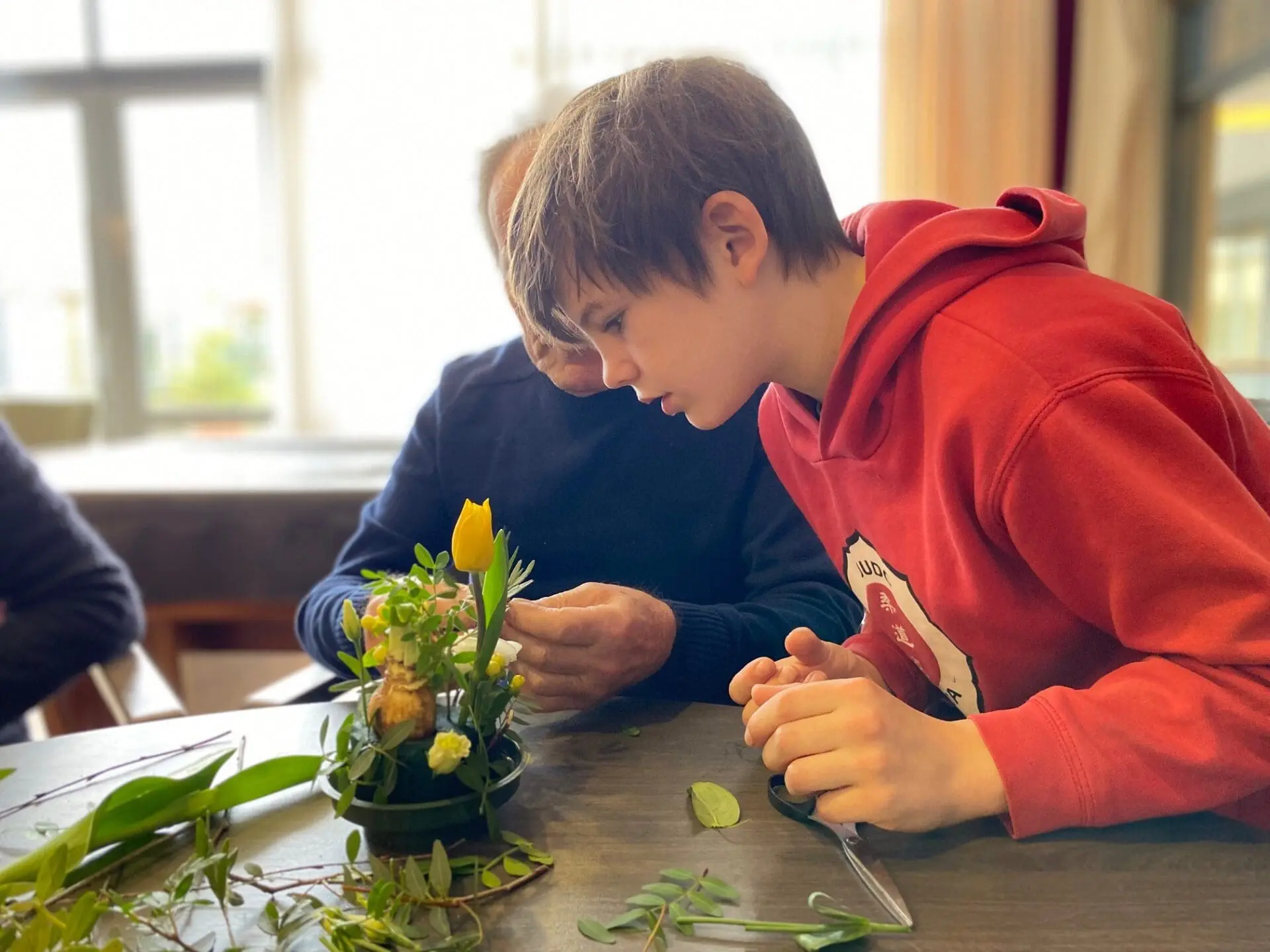 Ondertussen is Thijs meneer De Haard aan het helpen. “Hij helpt mij goed hoor, hij is er de hele tijd bij. Over het algemeen lukt het goed om het stukje te maken”, vertelt meneer De Haard. Uiterst geconcentreerd en met volle precisie knipt Thijs de takjes kort en steekt ze voorzichtig in het steekschuim. Tussendoor een gele tulp en wat witte bloemen. “Ik heb het nog nooit eerder gedaan. Meneer vindt het ook leuk om zelf wat te doen”, zegt Thijs. Een medewerker Welzijn loopt langs: “Wie wil er lint voor om het stukje? Paars of oranje?” Thijs kijkt meneer aan: “Wilt u lint?” Het is het paarse lint geworden. Er komt een mooie strik om het paasstukje. De twee blijven als een van de laatsten zitten, de overige bewoners zijn met hun paasstukje terug naar hun woning. Maar Thijs en meneer De Haard, die hebben de smaak te pakken!