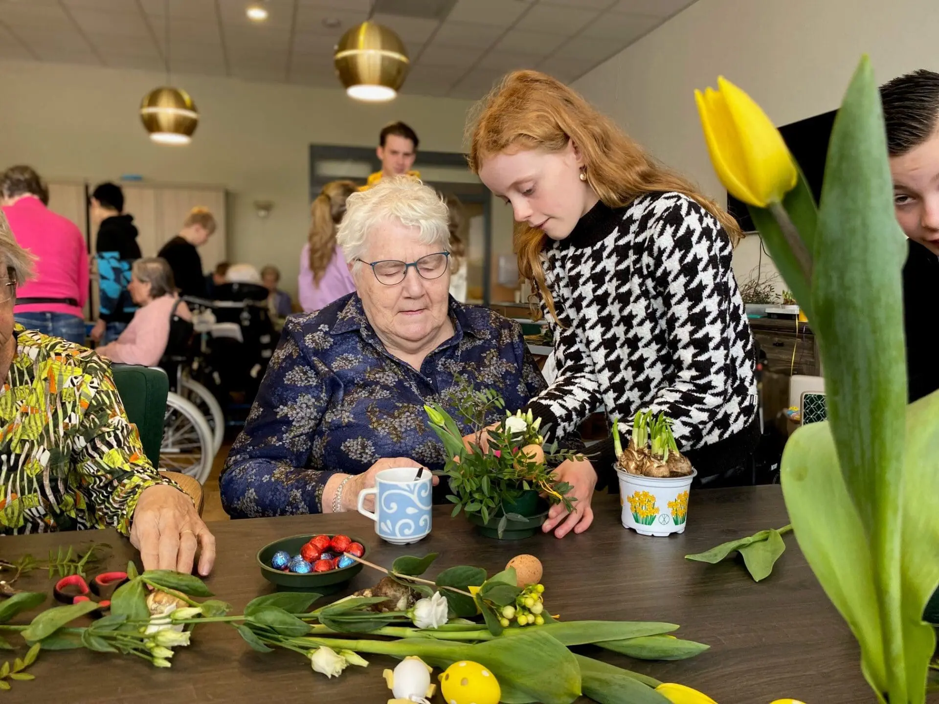 In de gemeenschappelijke ruimte van De Lingehof druppelen de bewoners langzaamaan binnen. De kinderen van groep 8 van basisschool De Borgwal uit Bemmel zijn er helemaal klaar voor. Vandaag gaan ze samen met de bewoners paasstukjes maken. Zo komt de wens van Joni in vervulling. “Kom oma, we gaan iets moois maken!”, zegt ze tegen de tante van haar vader, die ze oma noemt. Oma, mevrouw Moerkerk, woont hier nu anderhalf jaar. “Ben jij zo creatief dan?”, vraagt ze aan Joni. Voor mevrouw Moerkerk op tafel ligt een rond, groen steekschuim en verschillende soorten bloemen. Een klasgenoot van Joni loopt rond met een dienblad vol vrolijke hangers van paaseieren en haasjes. Het maakt de paasstukjes helemaal af.